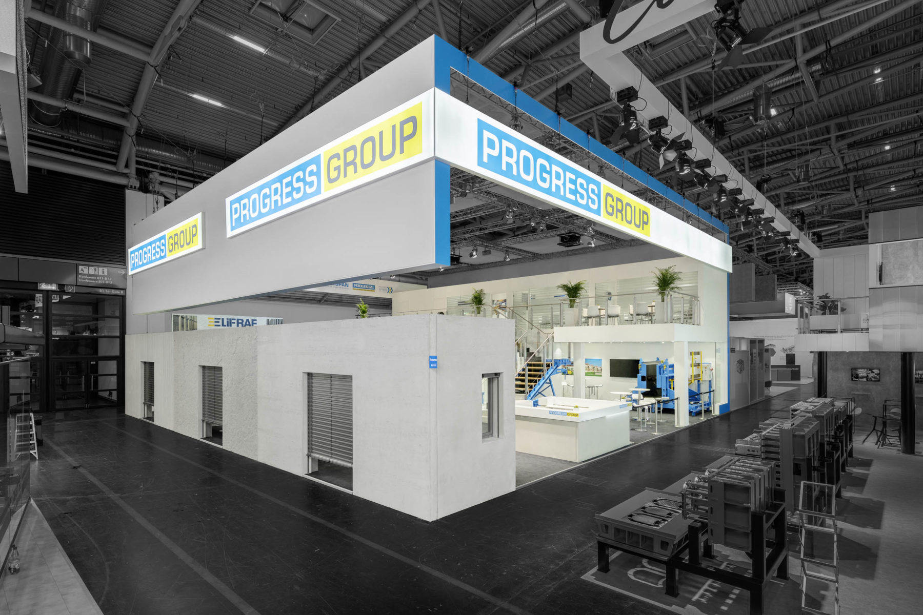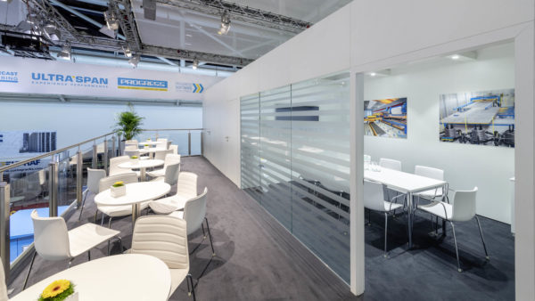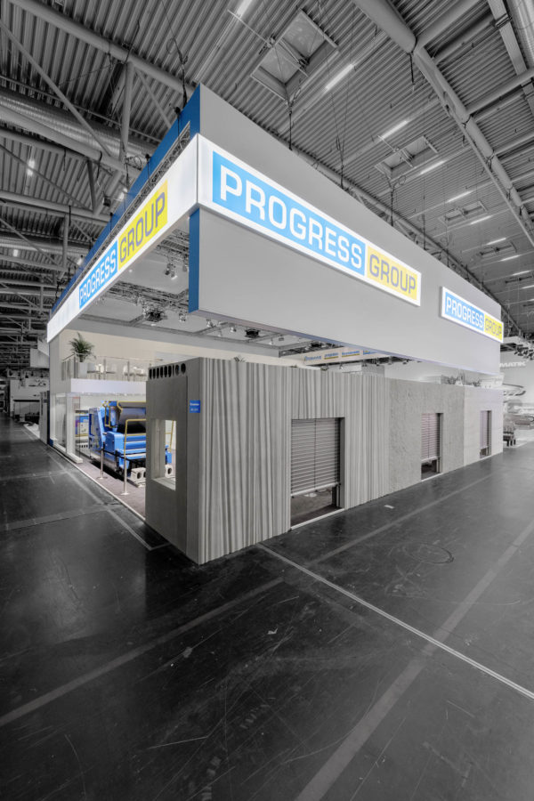 As one of the leading manufacturers of precast concrete plants, concrete had to be represented as a building material at the stand of our client Progress Group. The large reception counter formed an emerging symbiosis of concrete and painted components. The contrast between the two materials was additionally enhanced by an LED light strip. A striking banner, as well as a structured roof, gave the trade fair stand stability and space and created a lively setting. The Progress Group’s logo was wrapped in a ribbon and visible from every direction.