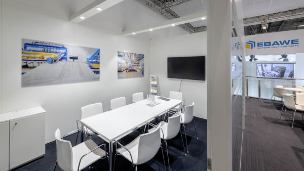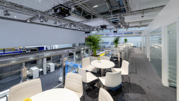 With the integration of a high stage, the lower area could be optimally used for product presentation and the upper area for communication. The first level included special surfaces for presentation purposes and the second level communication rooms. Positioning all exhibits in a neat way posed a major challenge – some of the machines were presented “live”, with special glass conversions ensuring work safety.