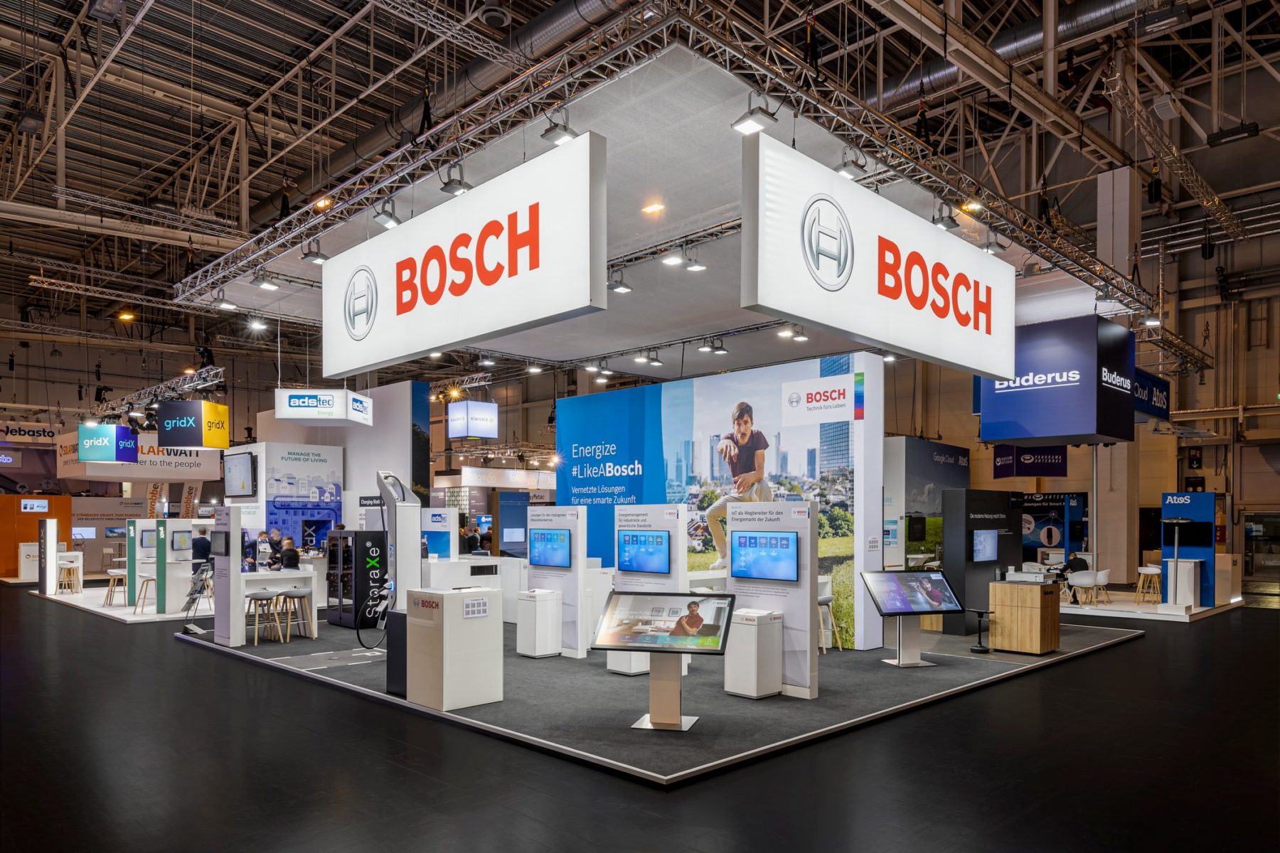 As the meeting point for the European energy industry, E-World energy & water is one of the most important trade fairs of the year. Exhibitors from all over the world present sustainable technologies and intelligent services for the future of energy. Our customer Robert Bosch GmbH presented itself this year on a joint stand with several Bosch areas. This formation offers an optimal overview of the broad solution portfolio in the energy sector. The exhibition stand creates the creative harmony of the different areas.