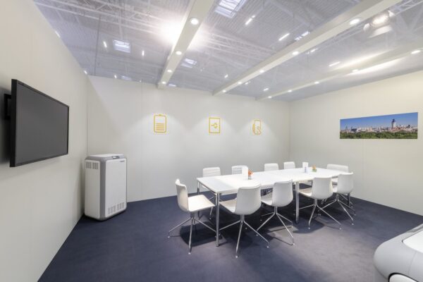 The entire concept behind the two-storey presentation and communication area was based on SENEC’s 360-degree vision. The centrally located reception area was the heart of the themed areas available on the basement and upper floors. The suspended, continuously back-lit banner with blue LED stripes grabbed visitors attention. The whole apparatus could be controlled, dimmed and individually programmed for various scenarios during the fair via a DMX interface. Furthermore, the mounted mobile disco ball with a diameter of 1.5 m was a pleasant surprise and created a relaxed atmosphere at the evening event.